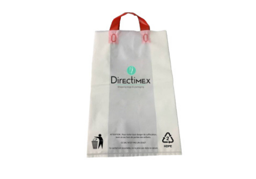 direct imex white PE bag with red handle | sac PE recycle blanc a anses rouges direct imex